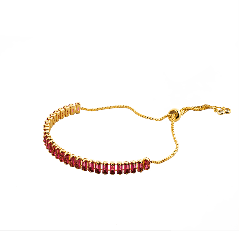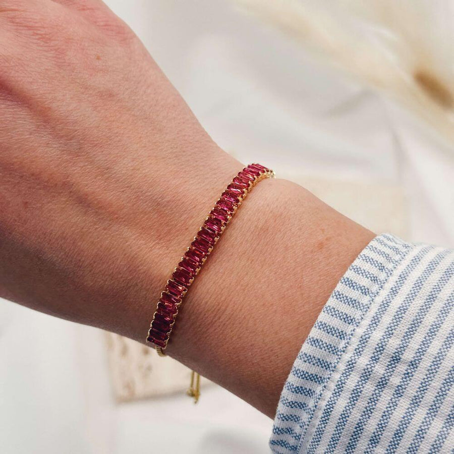 De Robijnrode Armband Aurea is geïnspireerd op de geboortesteen van juli – de robijn. Zijn dieprode, baguettegeslepen stenen staan voor liefde, moed en passie. Dankzij het flexibele schuifkogelbandje individueel verstelbaar, begeleidt deze armband je als een elegante uitdrukking van je innerlijke kracht – ideaal als verjaardagscadeau of persoonlijk statement.