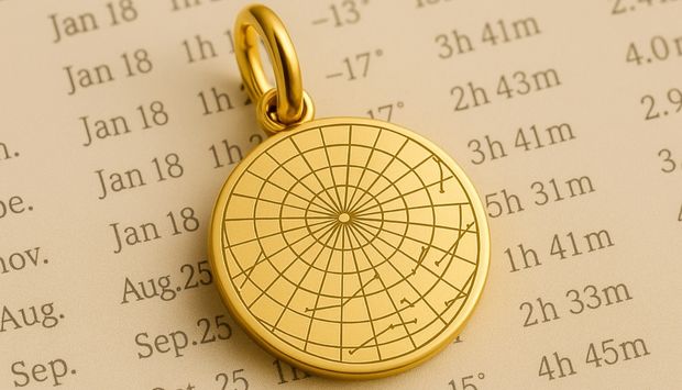 Wir berechnen mit spezieller Astronomie-Software das echte Sternenbild deines gewählten Moments – basierend auf Datum, Uhrzeit und Ort. Das Ergebnis wird in ein präzises Gravurmotiv umgewandelt und mit höchster Sorgfalt in Deutschland gefertigt. Jeder Anhänger ist ein exaktes, emotionales Abbild deines Himmels.